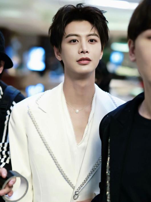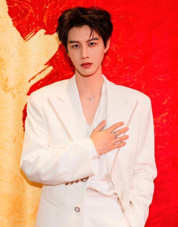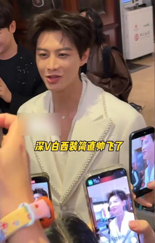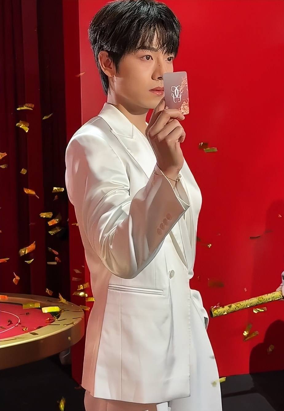 他身着深V白西装亮相,简约的版型勾勒出挺拔的身形,深V设计增添了几分精致感,整个人自带贵气,和娇兰品牌的奢华气质完美契合。