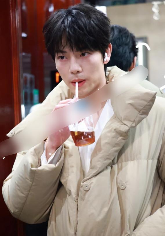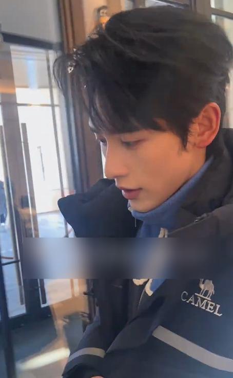 他穿了一件棕色羽绒服,搭配简单的内搭,整体造型休闲随意,和其他演员的正式穿搭形成了反差。