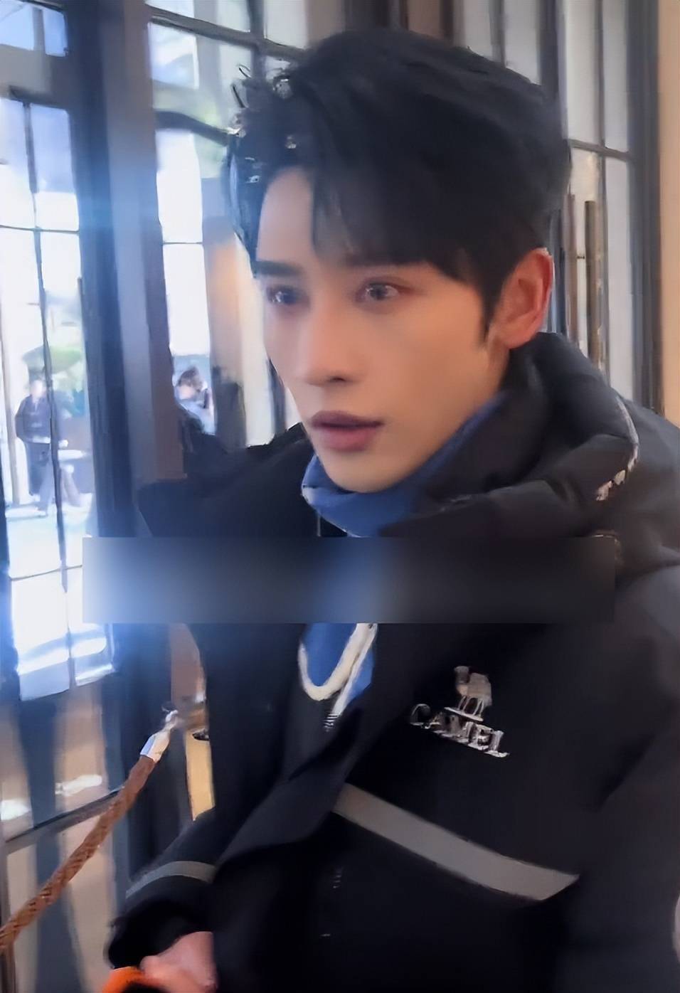他当天穿了一件黑色羽绒服,内搭蓝灰色羊毛毡材质的衣物,简约又不失质感,穿搭风格很适合他的气质。
